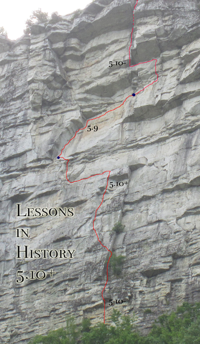 Lessons in History wends its way through the most imposing terrain at Millbrook sharing many of the easier sections of much more serious routes. Remarkably the climbing never crests 5.10 and enables one to learn sections of such historic routes as